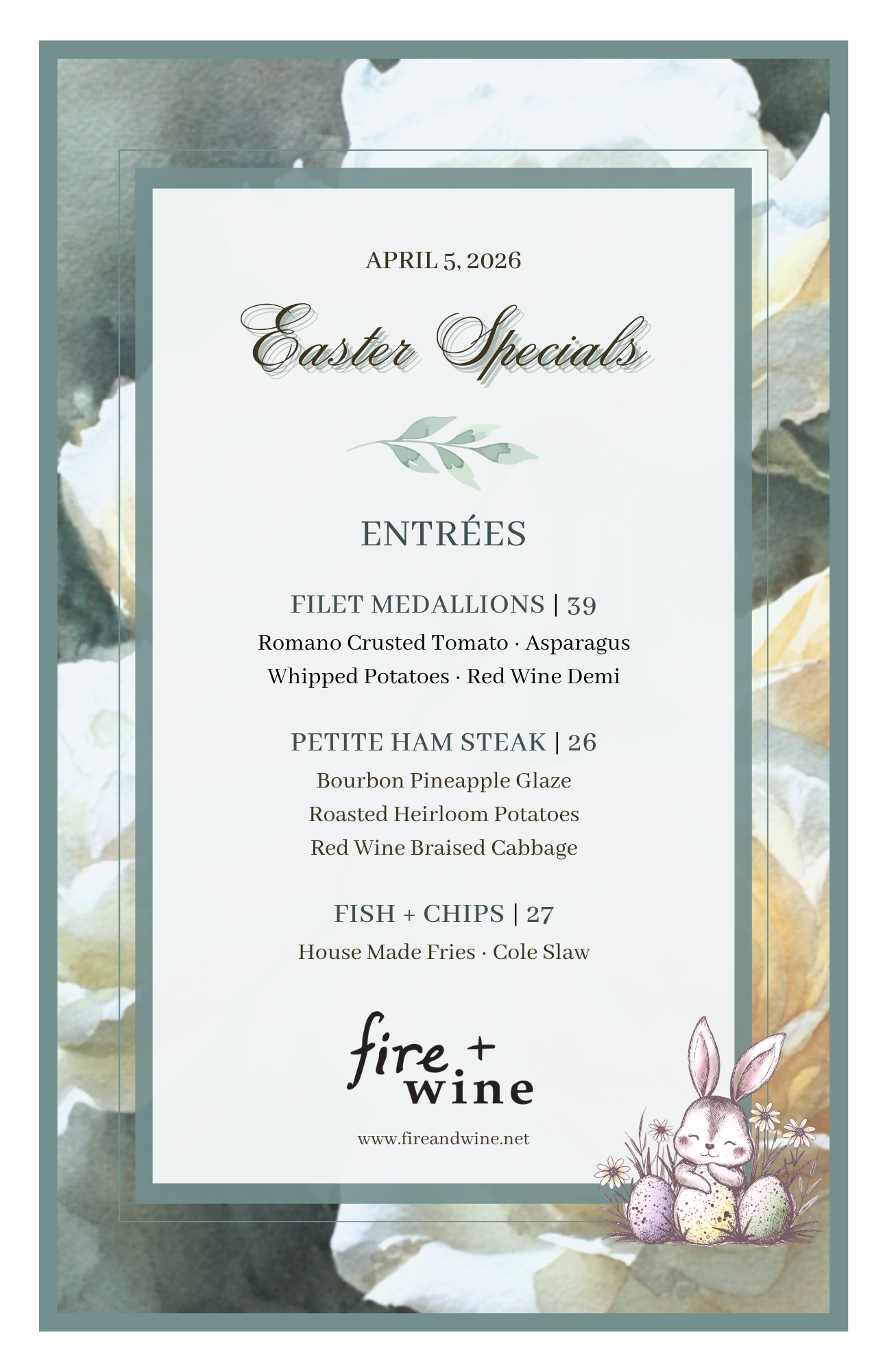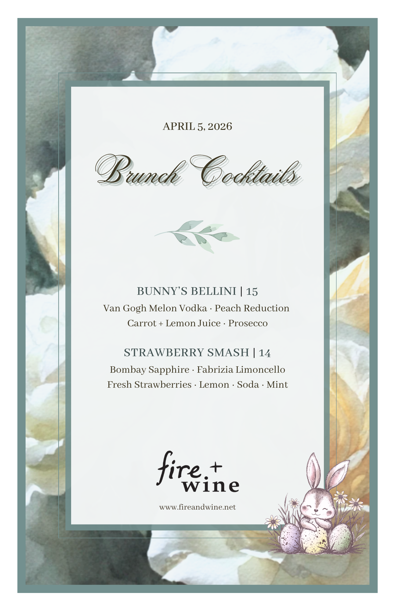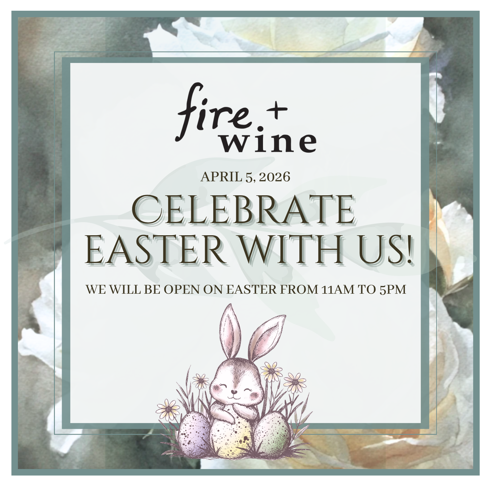 Easter at fire+wine! Celebrate Easter at fire + wine with chef-driven brunch, seasonal features, and spring cocktails in our warm, inviting setting.Open Easter Sunday, April 5 · 11am–5pmView our menus and make your reservation—our regular menu will also be available. Make Your Reservations Celebrate Easter at fire+wine! ✳︎ Celebrate Easter at fire+wine! ✳︎ Celebrate Easter at fire+wine! ✳︎